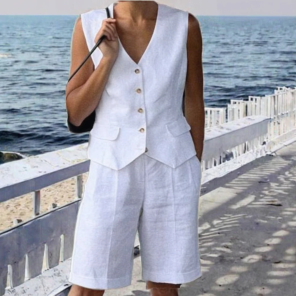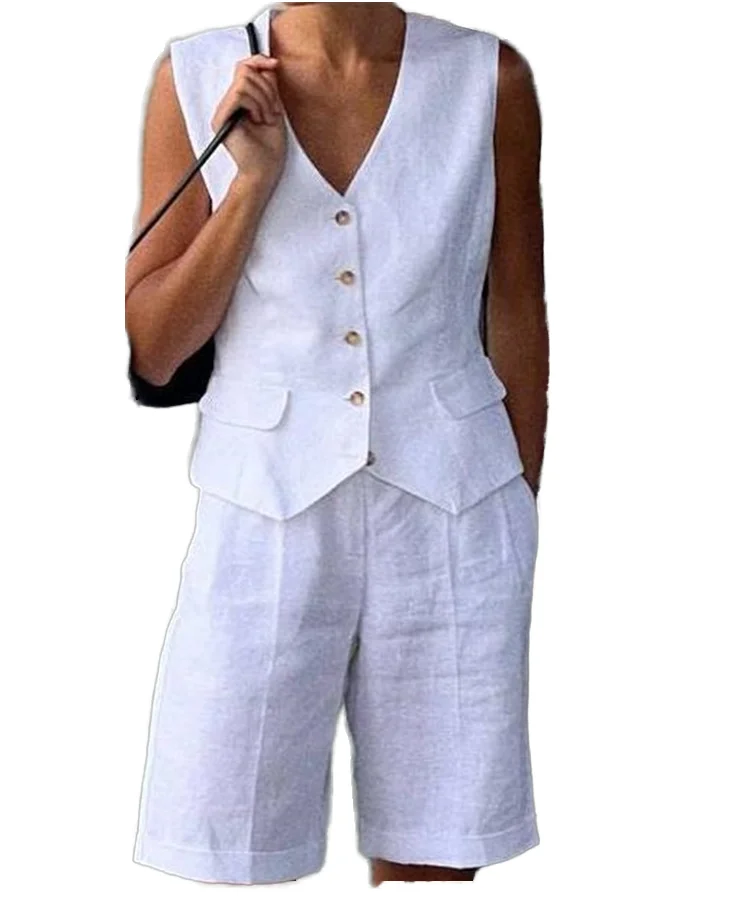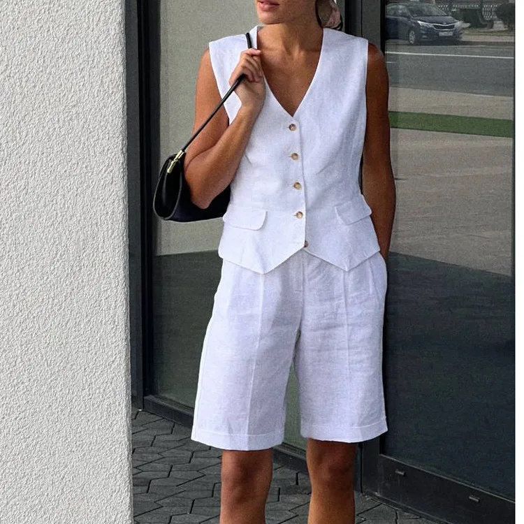 Women's Sleeveless V-Neck Vest Sets Customized Logo Solid-Color Loose Clothing Direct Sale by Manufacturer for Summer